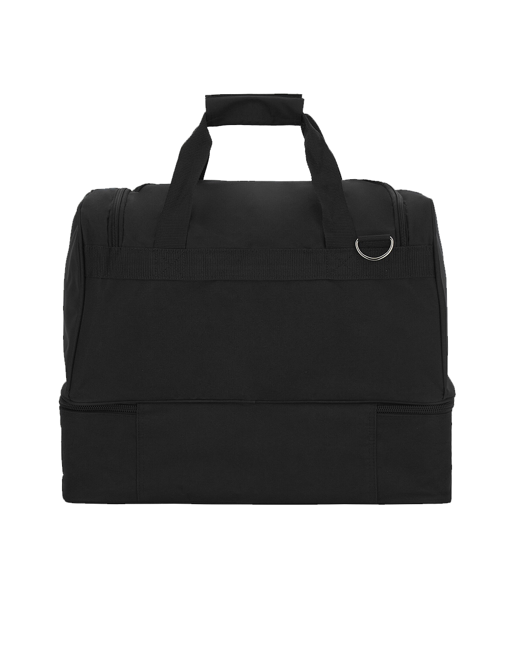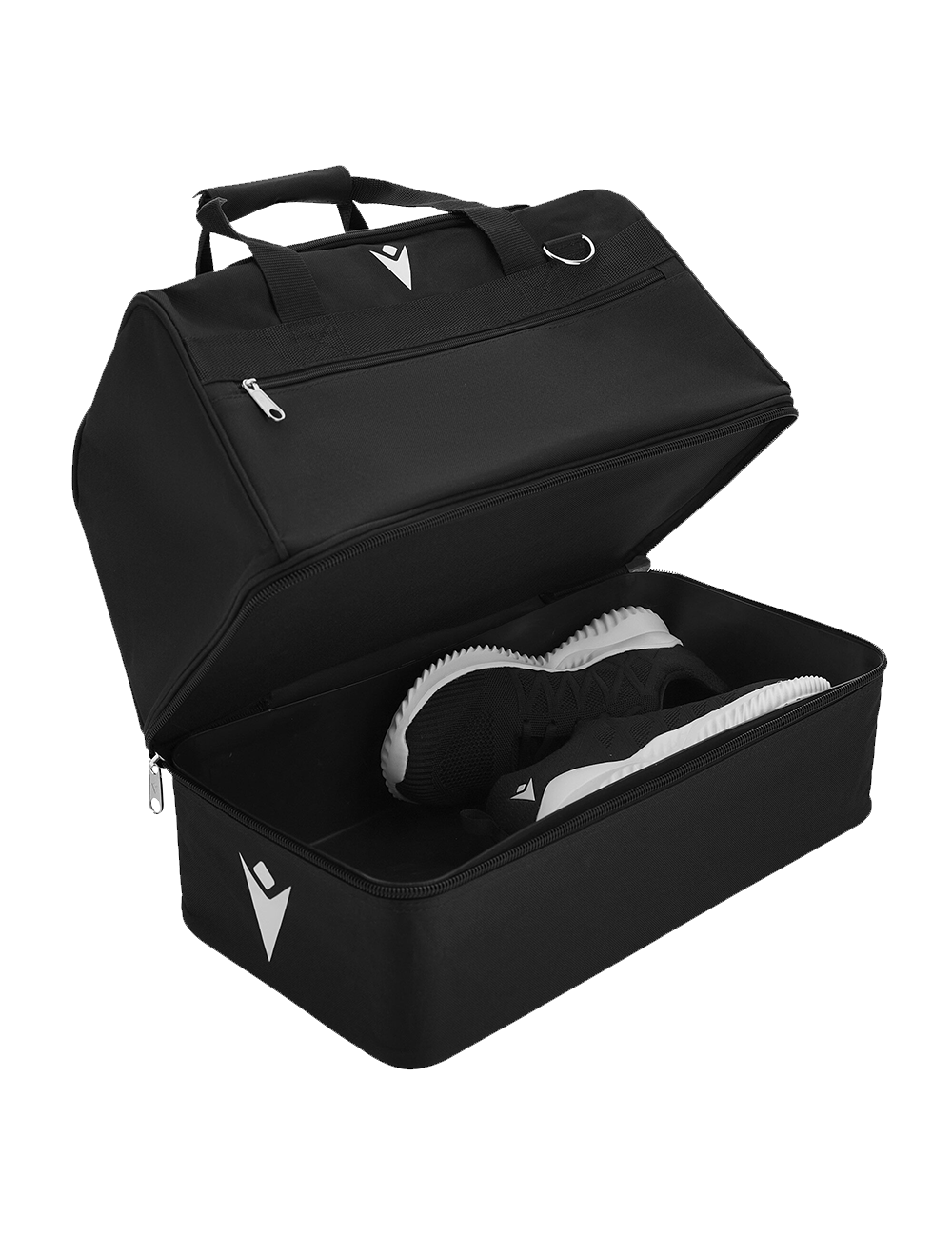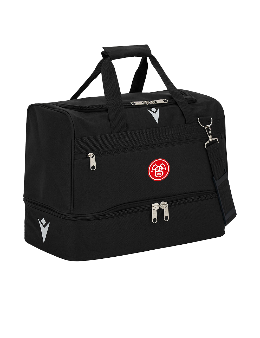 En praktisk sportstaske med et stort centralt rum med en stor åbning, som kan lynes hele vejen rundt. Tasken har en frontlomme med lynlås, samt en stiv skalbund, som er ideel til sko. Skalbunden kan tages ud efter behov. Håndtaget er lavet med velcrobånd plus skulderrem til at bære tasken.