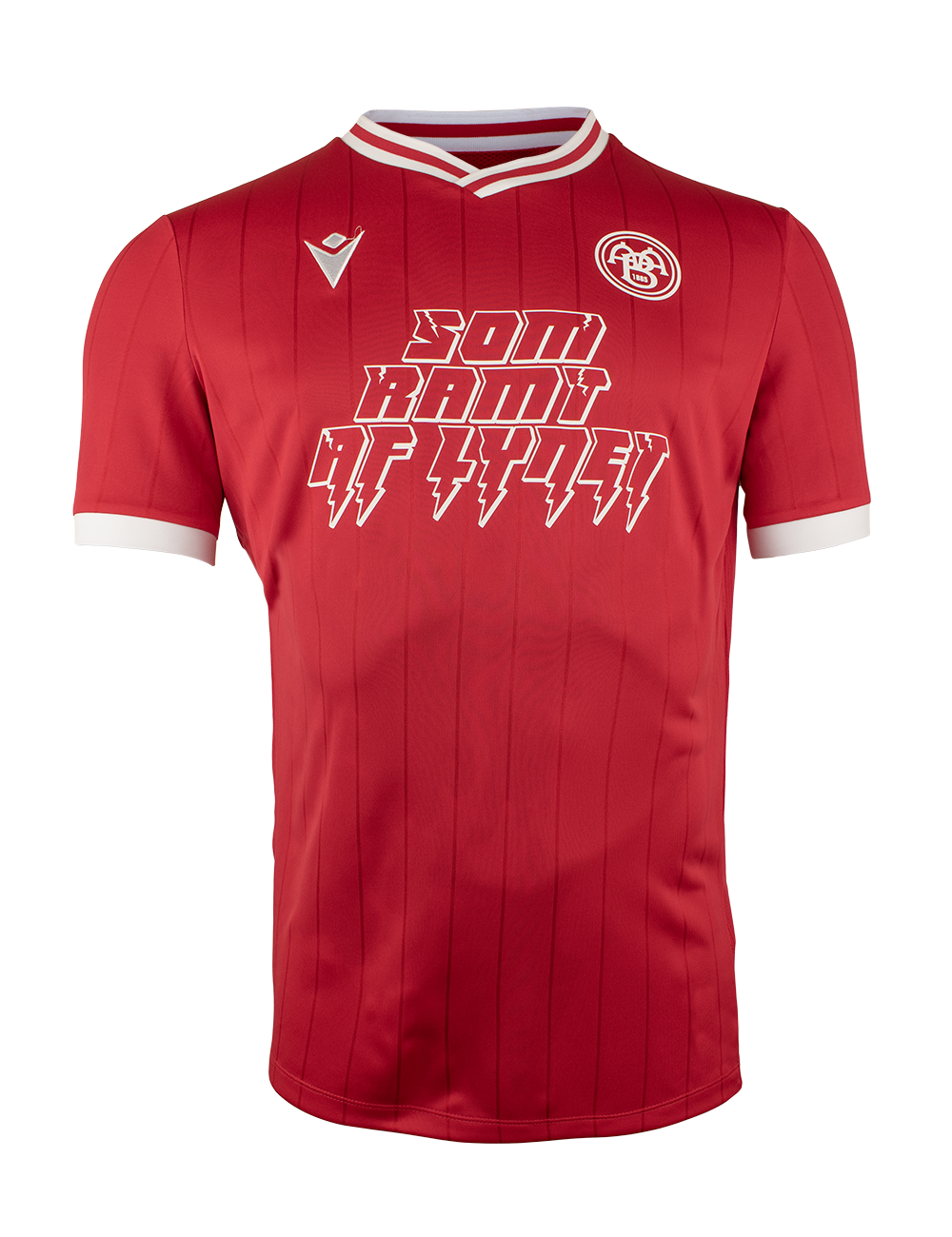 Den limiterede trøje er rød med elegante hvide detaljer og prydes af AaB's flotte logo på brystet. På maven fremgår "Som Ramt Af Lynet" med små lyn indarbejdet i skriften, hvilket giver et unikt og dynamisk udtryk.