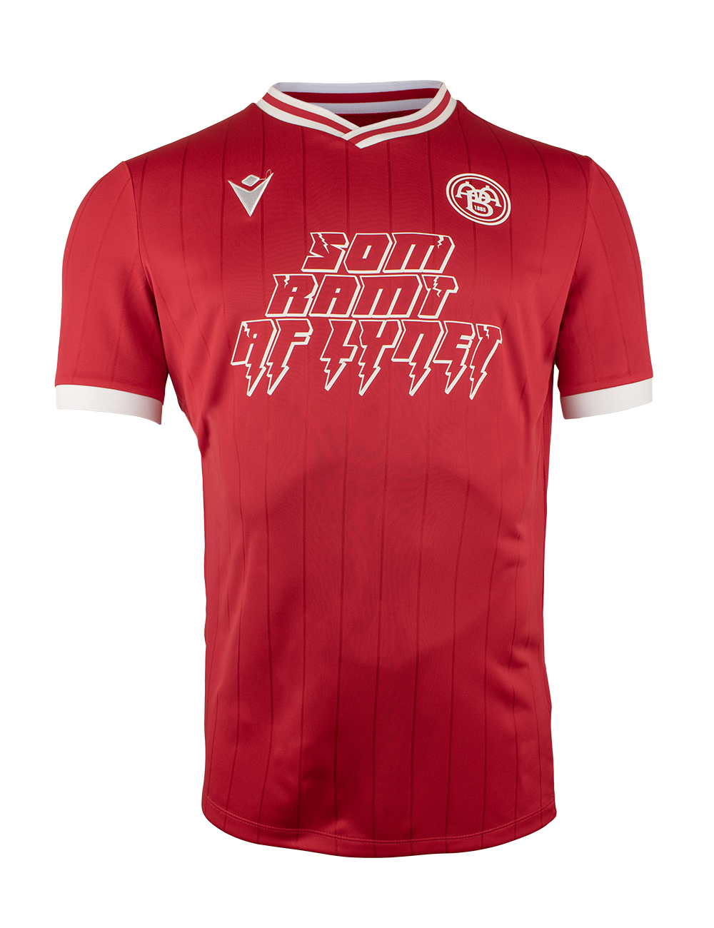 Den limiterede trøje er rød med elegante hvide detaljer og prydes af AaB's flotte logo på brystet. På maven fremgår "Som Ramt Af Lynet" med små lyn indarbejdet i skriften, hvilket giver et unikt og dynamisk udtryk.