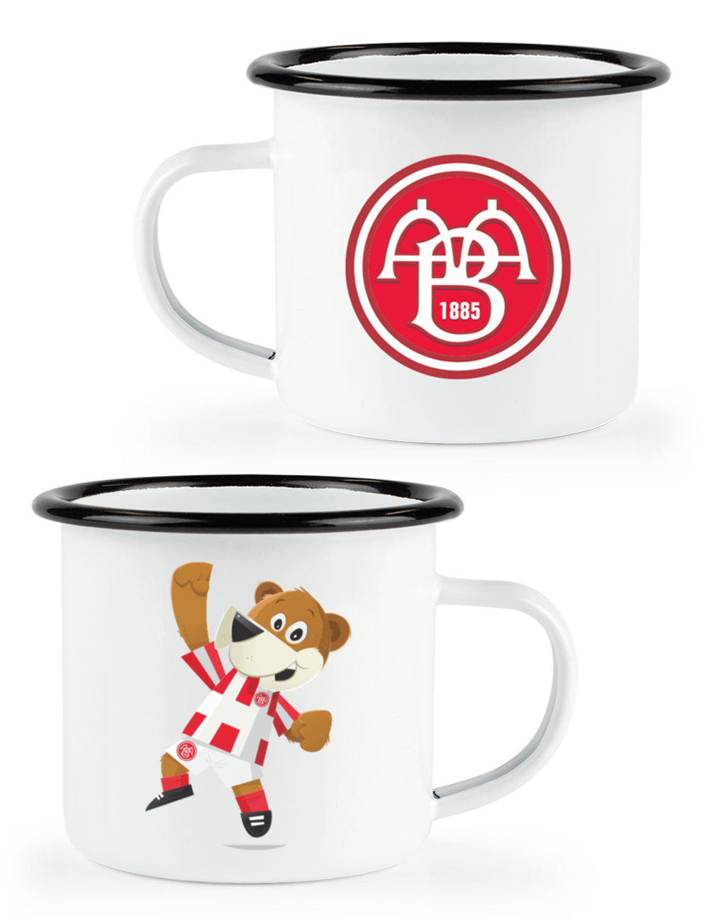Dette hvide emaljekrus er lavet med sort kant og hank. På den ene side ses en kampklar Theodor, og modsatte side det klassiske AaB logo. Theodor er altid klar til at støtte holdet og skabe stemning iblandt de fremmødte fans på stadion.