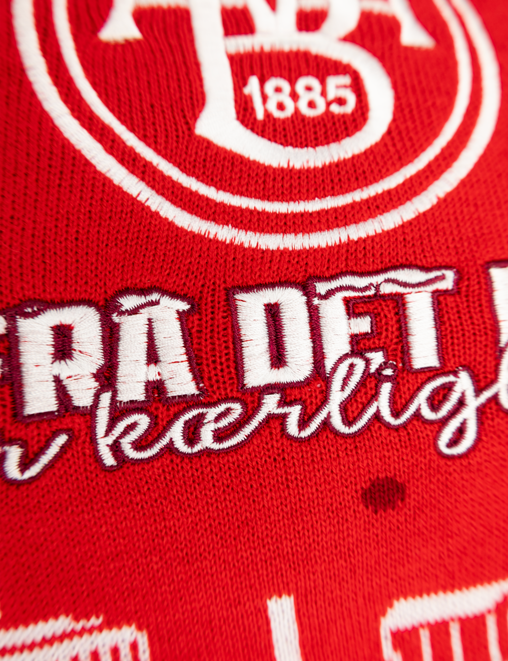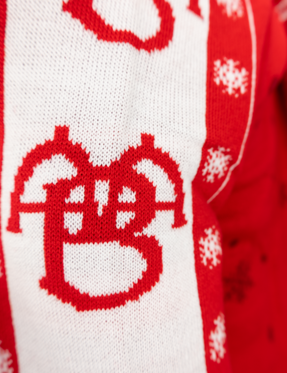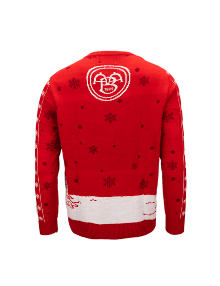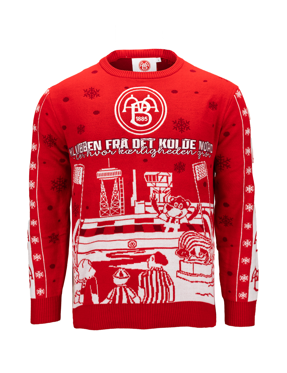 Årets røde julesweater prydes af hvide jule- og Aalborg-motiver, et broderet AaB logo samt teksten fra fansangen ‘’Klubben Fra Det Kolde Nord - Der Hvor Kærligheden Gror" der figurerer hen over brystet. Som en ekstra lækker detalje er teksten broderet. Julesweateren fås fra størrelserne 5-6 år op til 3XL.