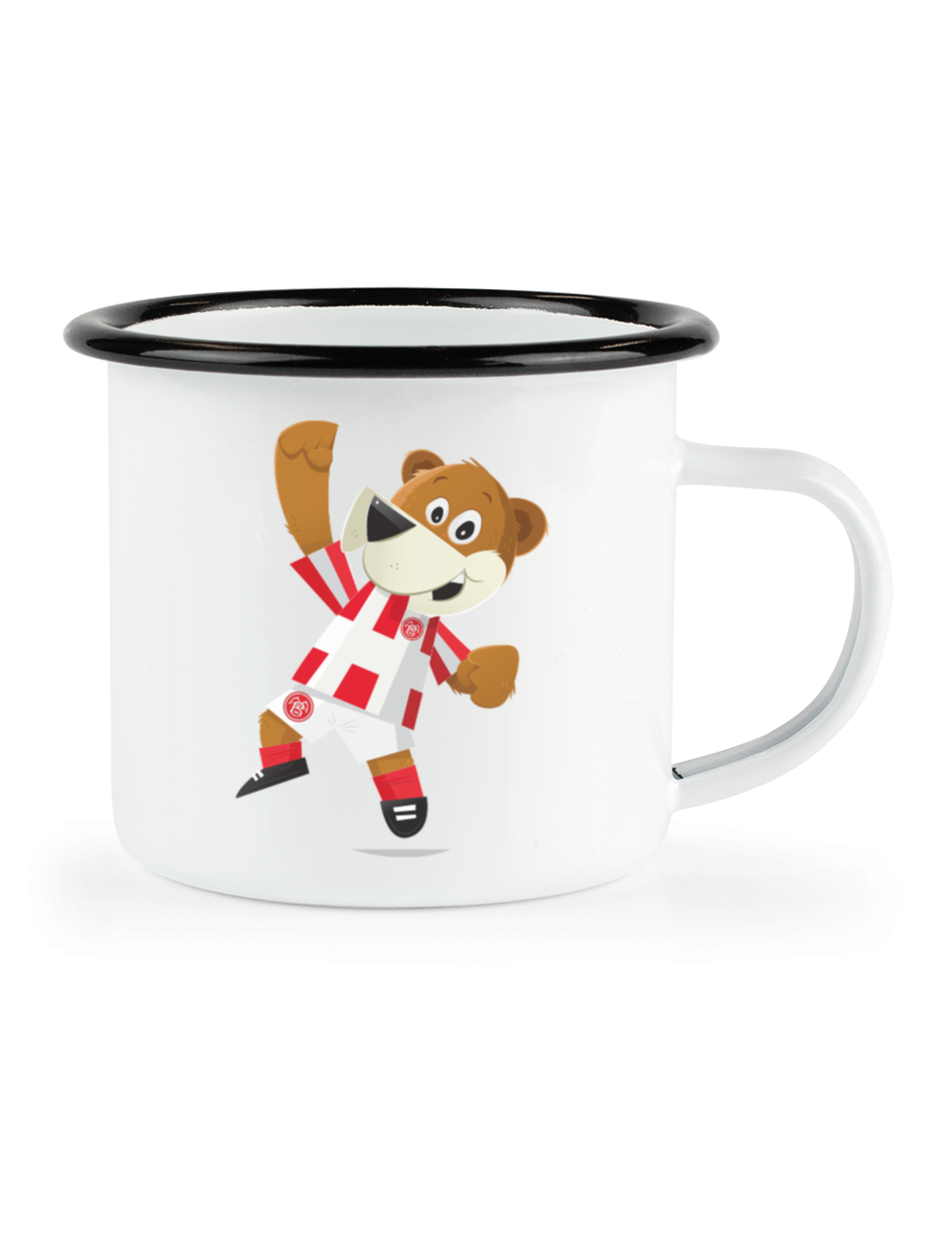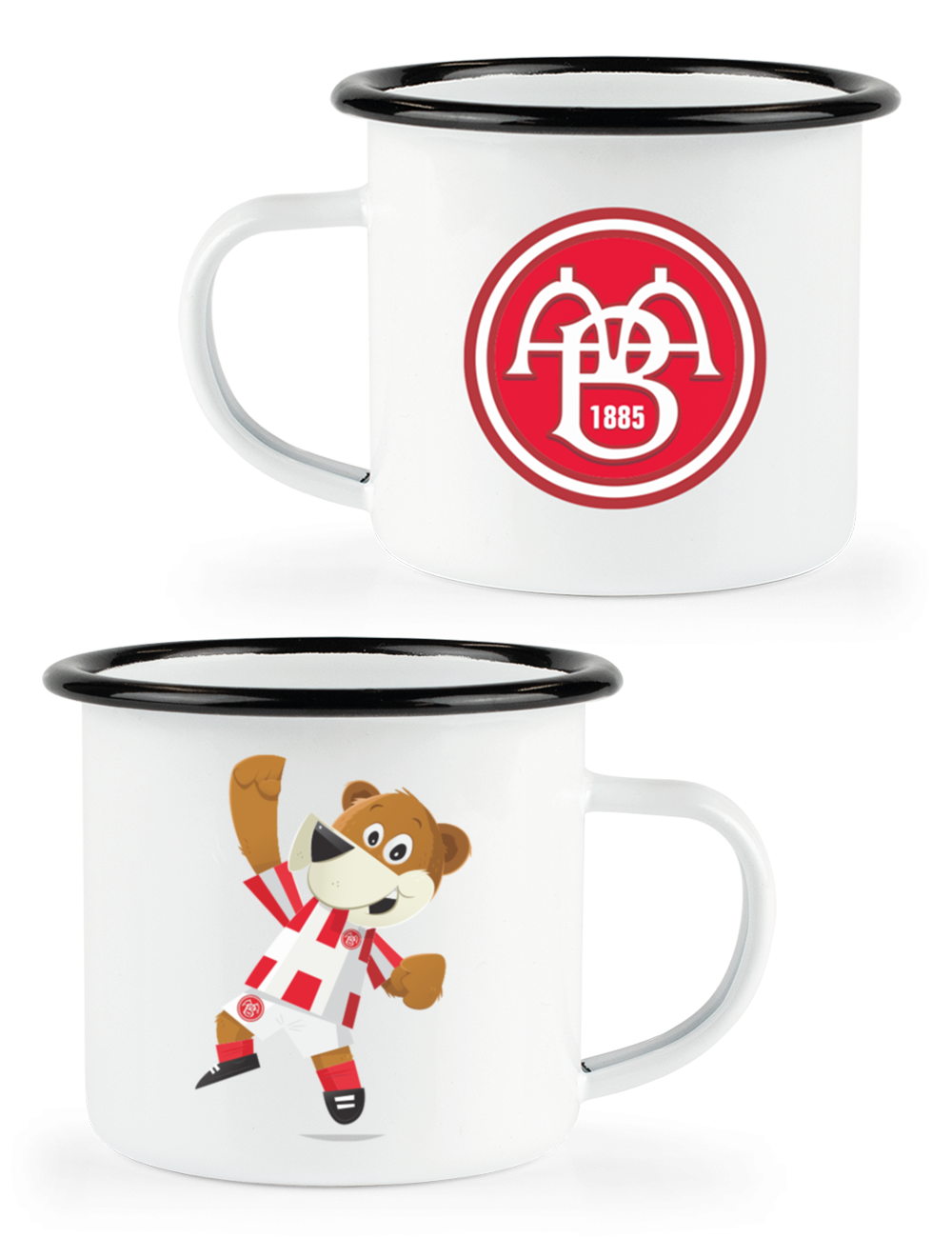 Dette hvide emaljekrus er lavet med sort kant og hank. På den ene side ses en kampklar Theodor, og modsatte side det klassiske AaB logo. Theodor er altid klar til at støtte holdet og skabe stemning iblandt de fremmødte fans på stadion.