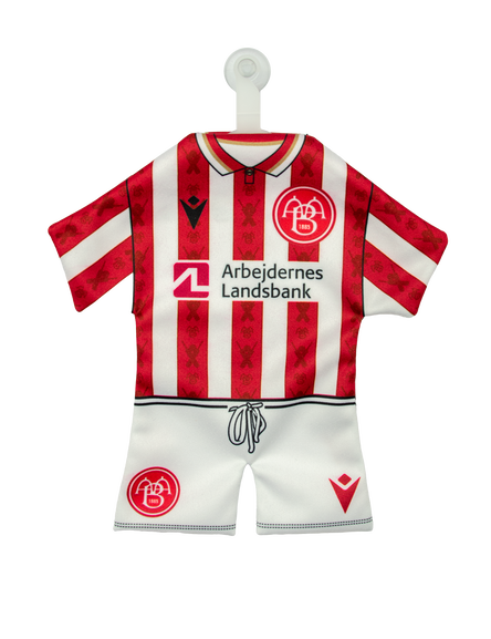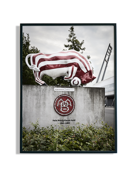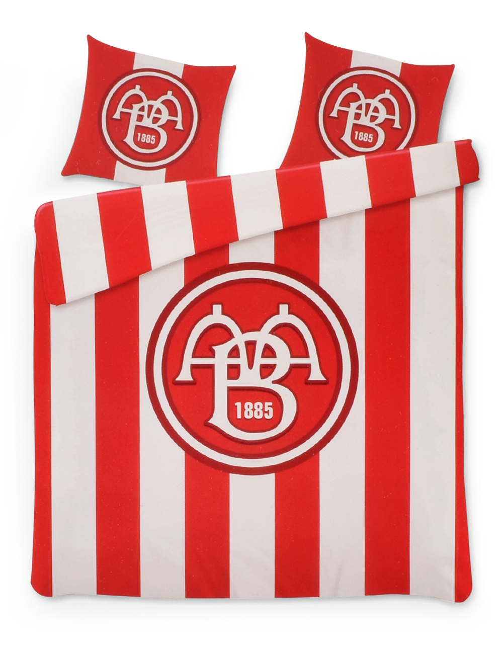 Sengetøj i AaB's farver pryddet med logoet og teksten "Hele Nordjyllands Hold"